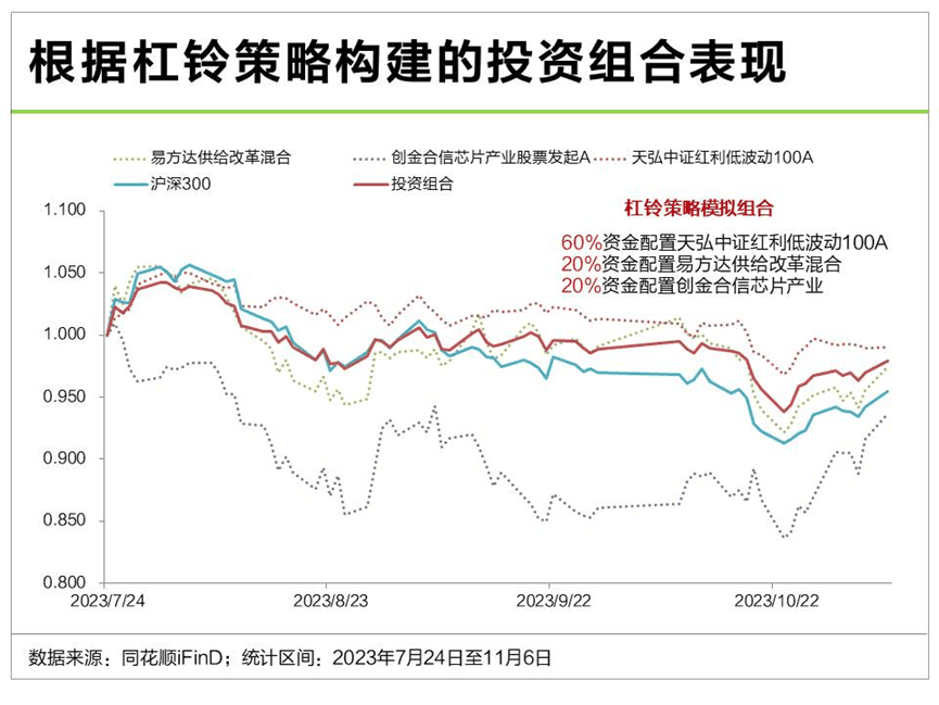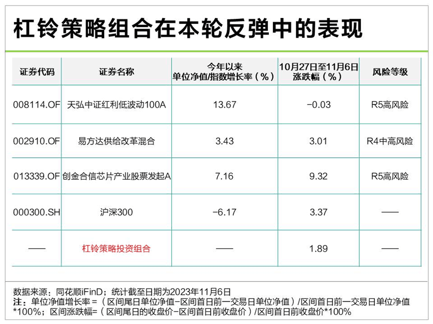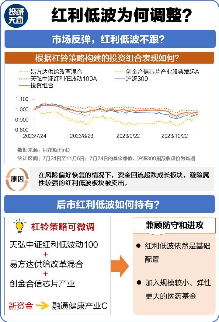 原因很简单,在风险偏恢复情况,资金回流医药、汽车等超跌成长板块,避险属性较强红利低波板块被卖。高低切换,是反弹时资金正常现象。这也是为什么,们在杠铃策略中,除了超配红利低波,也同时配置科技成长板块。所以,杠铃策略反弹幅度虽不及沪深300,但依然能获得正收益。