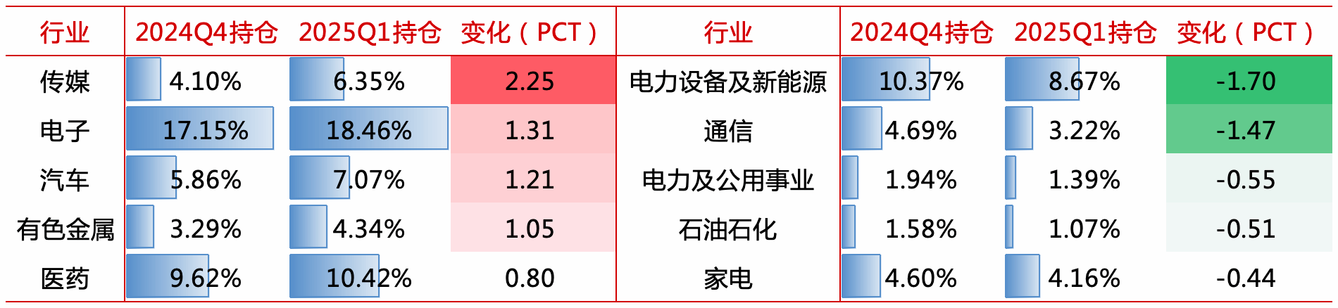 先看数据,一季度公募主动权益基金加仓最多行业是传媒、电子、汽车、有色金属和医药,其中传媒、电子、汽车已连续两个季度重仓增持,而有色金属和医药为2024年四季度两大减持行业。