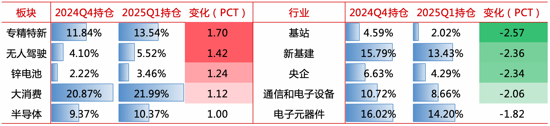 从板块角度来看,增配最多概念有专精特新、无人驾驶、锌电池、大消费和半导体;减持最多则是基站、新基建、计算机通信等方向。