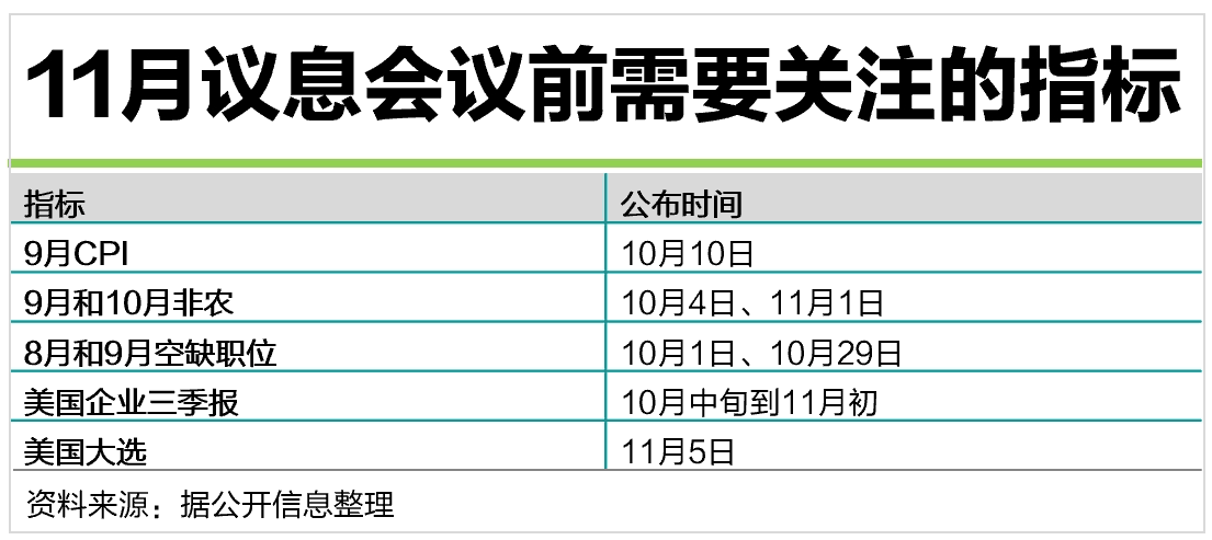 美联储一次议息会议在116-7,在这期间,还有两组度就业数据、以及一组度通胀数据可以观察。另外,美企业即将发布三季报,也可以从企业盈利角度观察美经济健康度。
