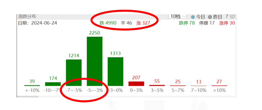 天团写今天这篇文章时候,大盘又回到3000点之。624收盘,A股有4990只股票跌,只有327只涨, 3600多只跌幅在3%以(图),两市成交不到7000亿。