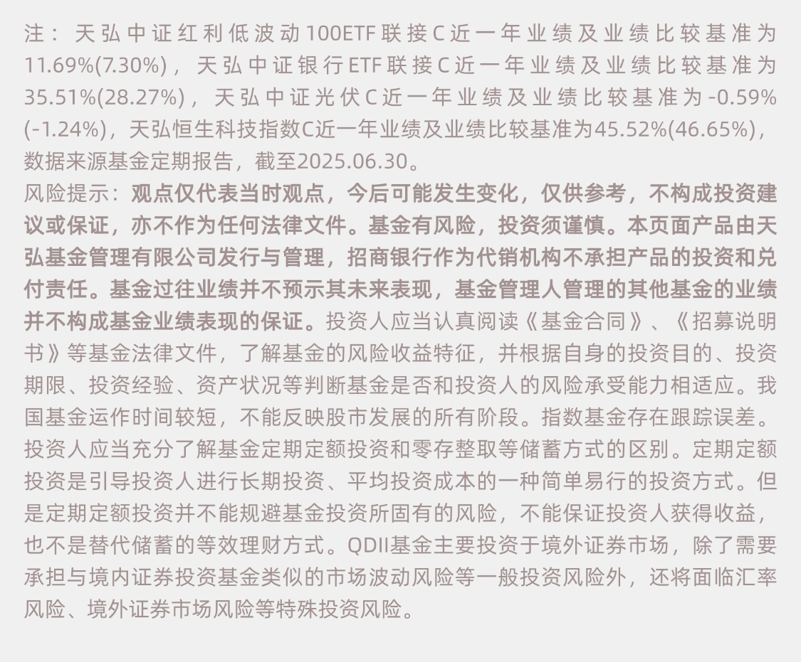 风险提示:活动详情详见内页。本文观点仅代表当时观点,今可能发生变化,仅供参考,不构成投资建议或保证,亦不作为任何法律文件。基金有风险,投资须谨慎。本页面产品由天弘基金管理有限公司发行与管理,商行作为代销机构不承担产品投资和兑付责任。基金过往业绩并不预示其未来表现,基金管理人管理其基金业绩并不构成基金业绩表现保证。投资人应当认真阅读《基金合同》、《募说明书》等基金法律文件,了解基金风险收益特征,并根据自身投资目、投资期限、投资经验、资产状况等判断基金是否和投资人风险承受能力相适应。基金运作时间较短,不能反映股市发展所有阶段。指数基金存在跟踪误差。投资人应当充分了解基金定期定额投资和零存整取等储蓄方式区别。定期定额投资是引导投资人进行长期投资、平均投资成本一种简单易行投资方式。但是定期定额投资并不能规避基金投资所固有风险,不能保证投资人获得收益,也不是替代储蓄等效理财方式。QDII基金主要投资于境外证券市场,除了需要承担与境内证券投资基金类似市场波动风险等一般投资风险外,还将面临汇率风险、境外证券市场风险等特殊投资风险。