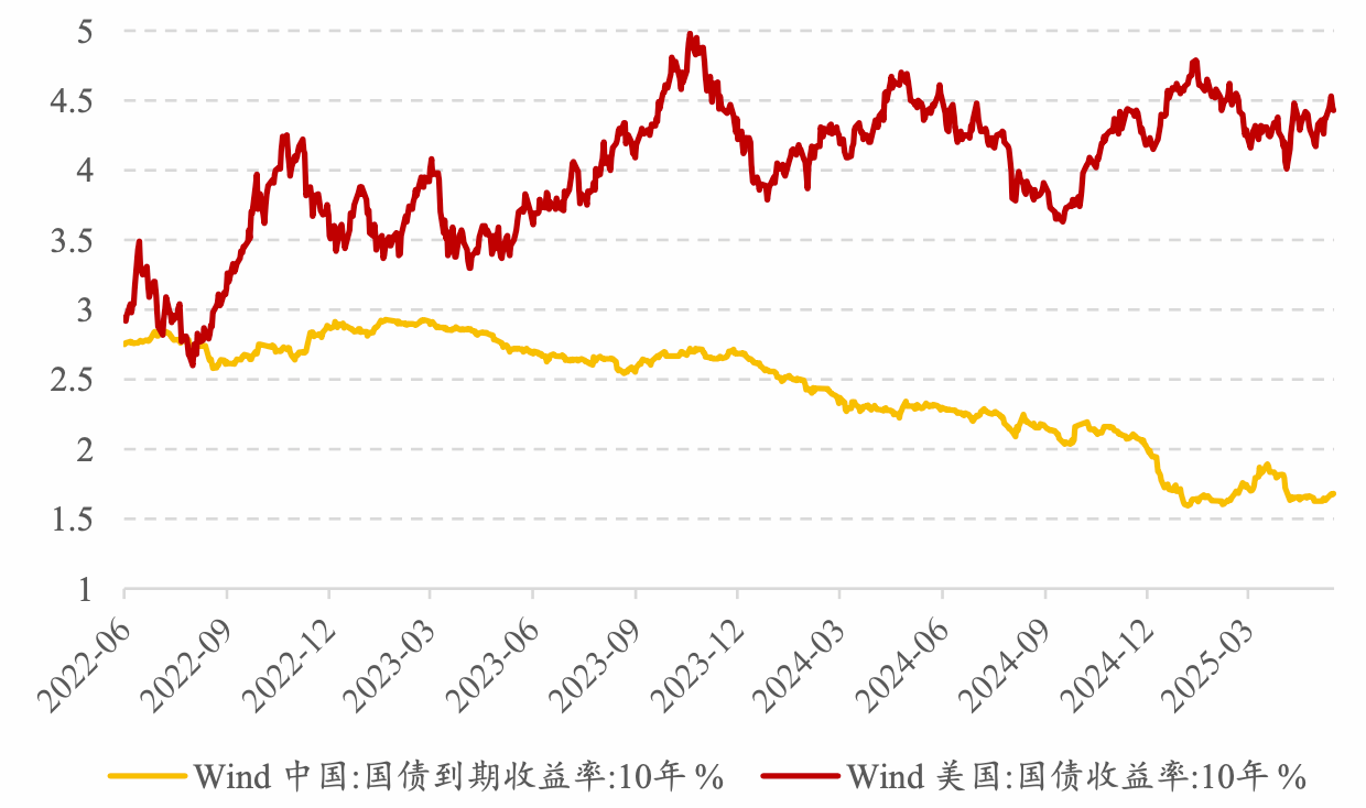 中美十年期债利率走势比;资料来源:Wind、方正证券,2022-6~2025-5