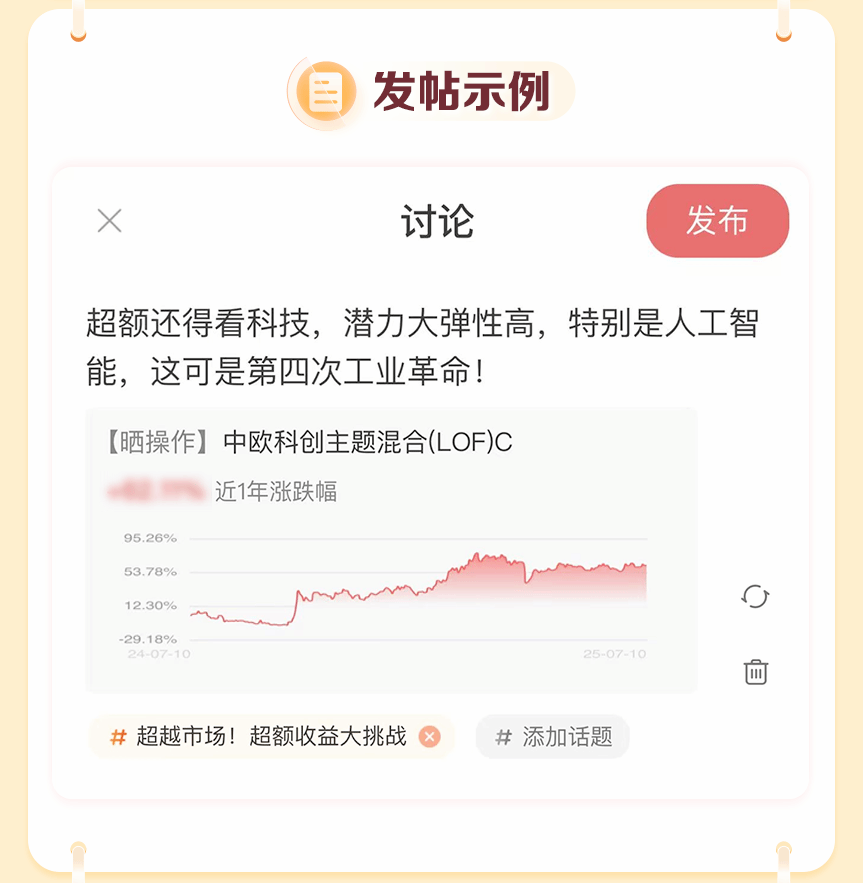关注中欧基金财号。关注中欧科创主题混合(LOF)C/中欧数字经济混合C/中欧红利优享混合C,并进讨论区点击发帖留言(字数不少于15字,关联话题#超越市场!超额收益大挑战),并选择任意小工具(晒收益/晒操作/猜走势),分享超额密码。
