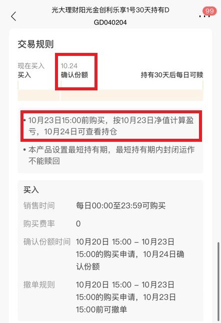 注意,发起申购这个动作,并不代表当天就能计算收益,具体要看产品规则。以光大理财阳光金创利乐享1号30天持有D(GD040204,R2-中低风险)为例,1023是交易,如果们在当15:00之提交申购申请,15:00时资金会划转到产品账户,们以23当天产品净值买了这个产品,应开始计算收益时间就是1023。