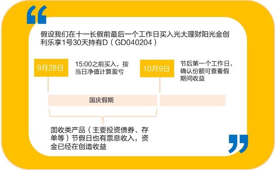 明确开始计算收益时间、确认份额时间,们就可回答长假团友提问了。如果在假期最一(928)15:00之申购,按照当时产品说明,那么假期间是可以享受收益。