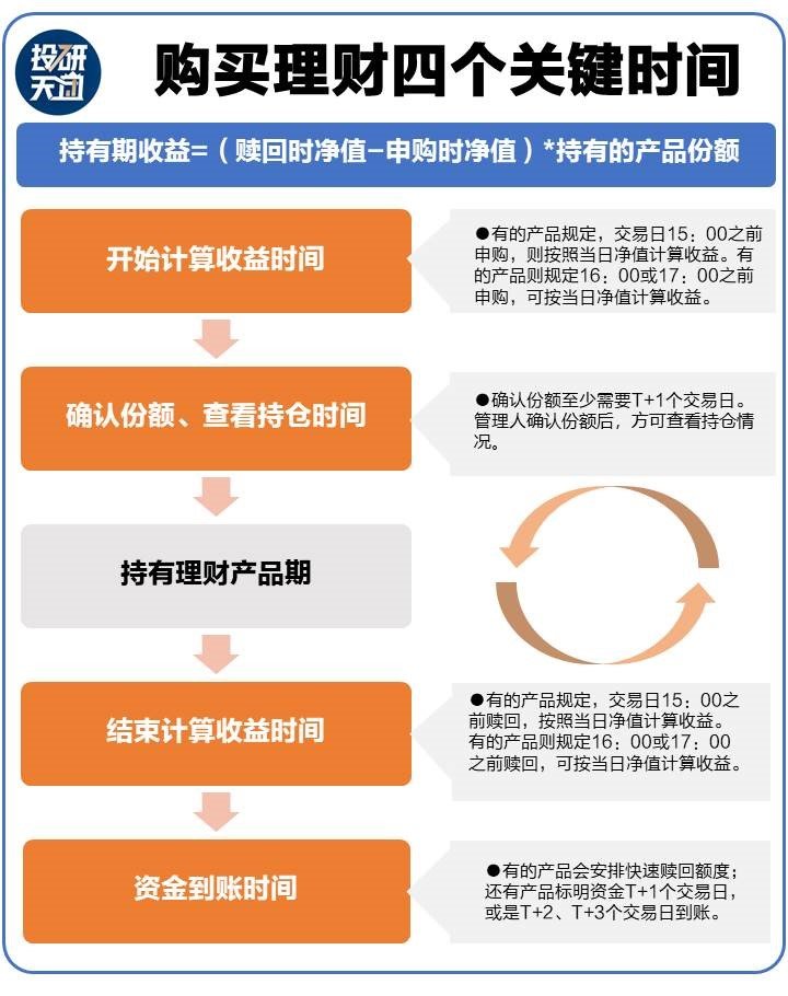 净值计算和披露要等到股市、债市、行间市场收盘才能开始,因此们买理财产品,是无法立刻知晓资金以什么净值买多少份额,于是就有第二个重要时间——确认份额时间。