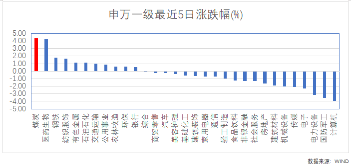 虽然创业板创新低,但周提到这几个行业都有涨,其中煤炭更是排名第一: