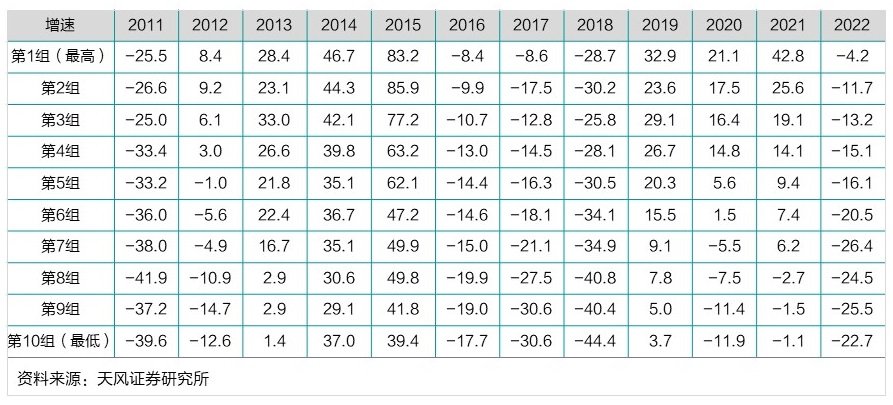 图:A股市场【财务指标】分组与每组【当年涨幅中位数】(表中数据为各组年度涨幅中位数,%)