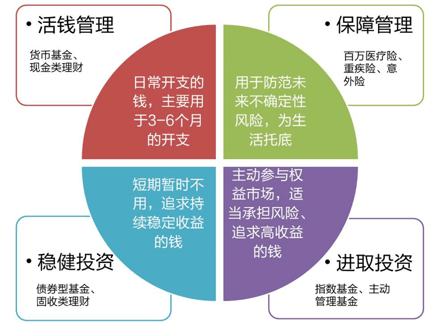 “四笔钱”本质是家庭收到手之,投资理财决策之,资金用途和风险承受能力做初步分类。