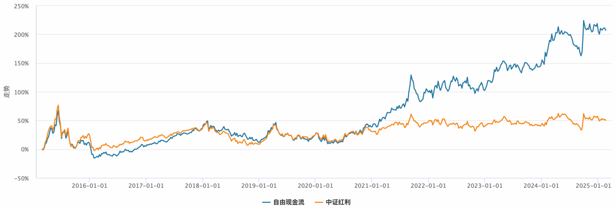 证自由现金流指数与得全A市场表现;资料来源:Wind,2015-2-27~2025-2-20