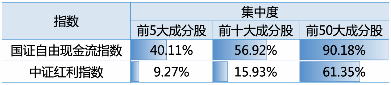 另外就是在集中度方面,由于加权方式区别,红利指数集中度较低,十大重仓股集中度只有9.27%,而证自由现金流指数十大重仓股集中度高达40.11%。
