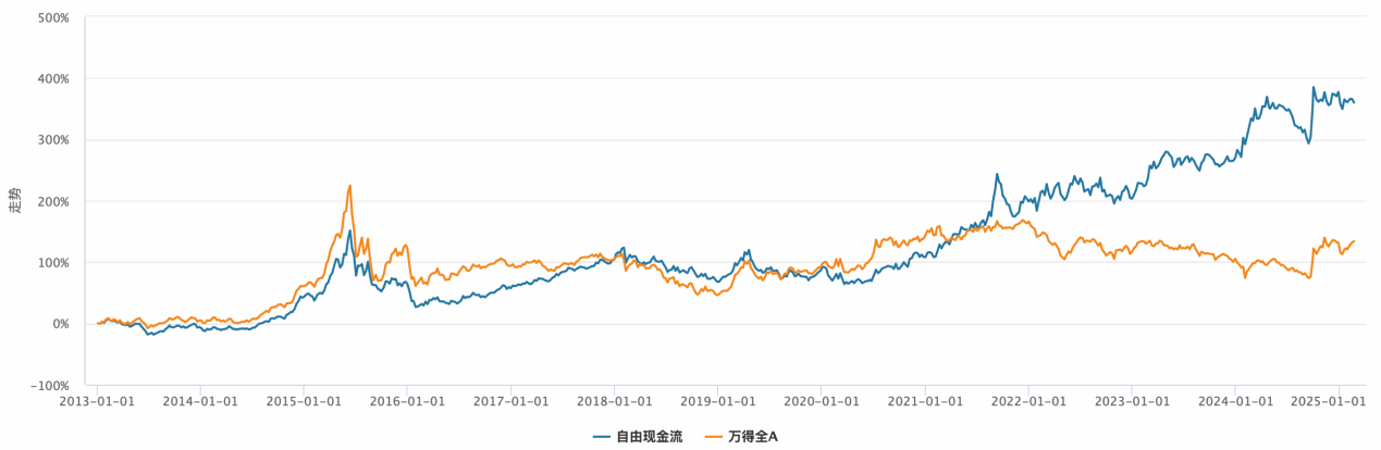 证自由现金流指数与得全A市场表现;资料来源:Wind,2012-12-31~2025-2-20