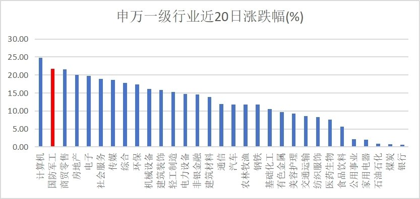 如期们推荐军工,最近20天涨幅已在21%以,所有行业排名第二: