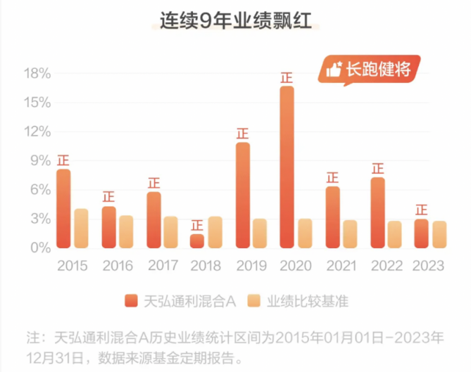 天弘通利混合A成立于2014年0314,成立以来近5个完整会计年度产品业绩及比较基准业绩为2019年10.5%(2.99%)、2020年16.31%(2.91%)、2021年6.3%(2.82%)、2022年7.14%(2.74%)、2023年2.99%(2.67%)。业绩数据来源于基金定期报告,截至2023年1231。