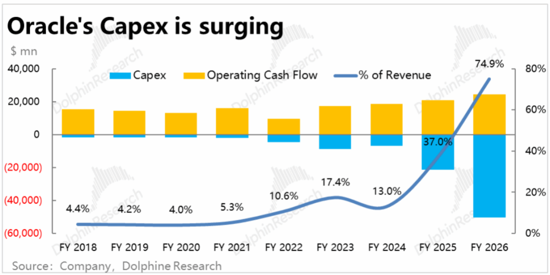 d. 高额Capex和负债压力已经不小,且高点还没到:同样和CoreWeave情况类似,大规模新建数据中心给Oracle在现金流和负债带来压力也是巨大。