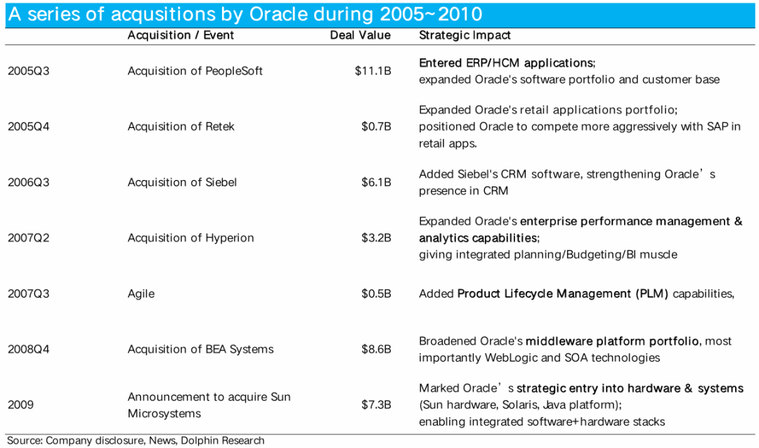 通过这些收购,Oracle迅速补强了其在企业管理软件技术能力和业务规模,成为了当时在该领域内仅次于SAP第二大龙头。