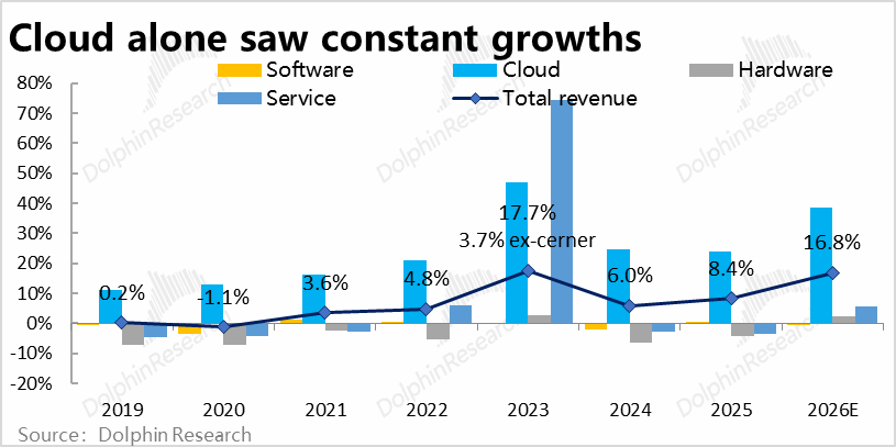主要改变是,原先云业务和软件业务是在同一大板块内一同披露,相互有所交叉。本次把云板块单纯拆来——更清晰分为云业务(Cloud),软件(Software),硬件(Hardware)和服务(Service)四大板块,以便市场能更清晰跟踪其云业务发展。