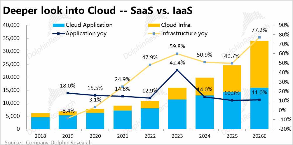 从复盘可以看到,Oracle原先传统核心业务--软件已持续衰退多年,云板块中SaaS类业务增长也不算强,近乎完全依赖于IaaS这一项业务带动增长。