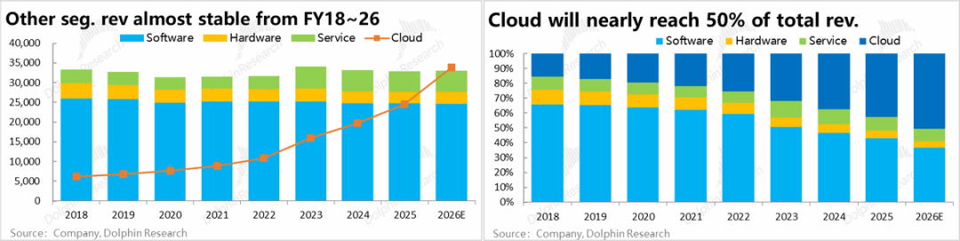 b. 云业务是近几年来公司唯一收增长来源,且在26财年将贡献过半公司总收,成为公司体量最大且增速最快核心业务板块。