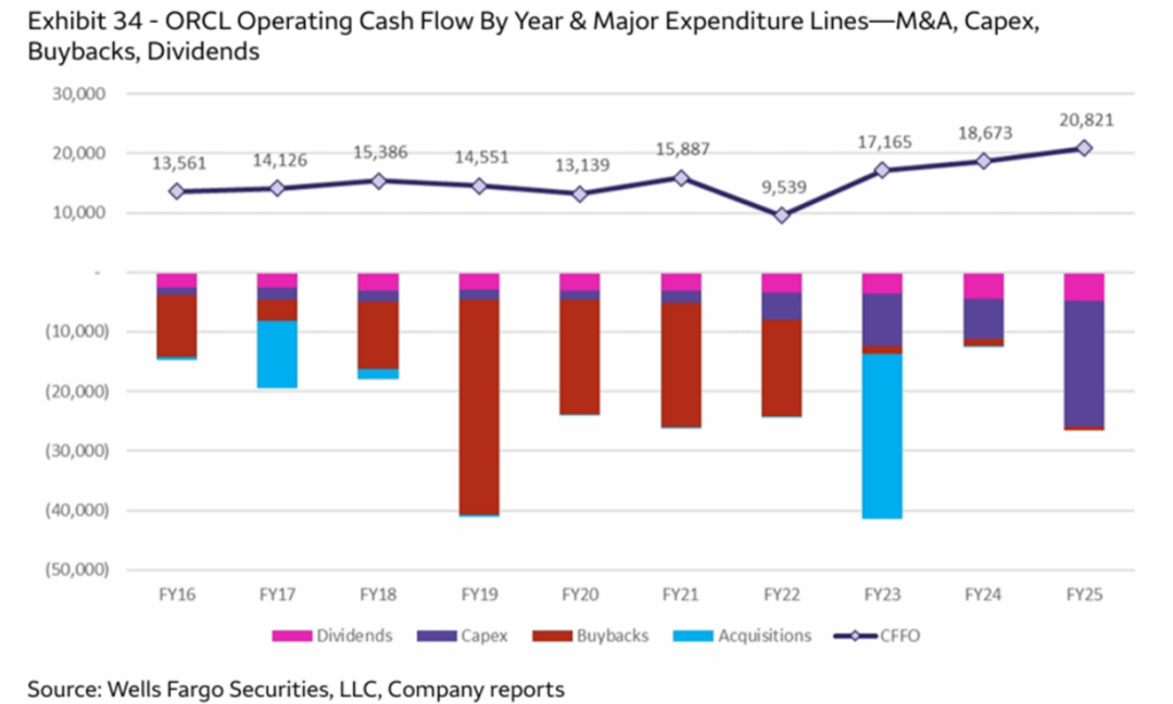 近十多年来Oracle一直采取“举债经营”理念。由图可见,16财年以来公司现金支就几乎每年都高于经营现金流,早年间主要用于巨量回购和外收购,未来则将主要用在Capex。