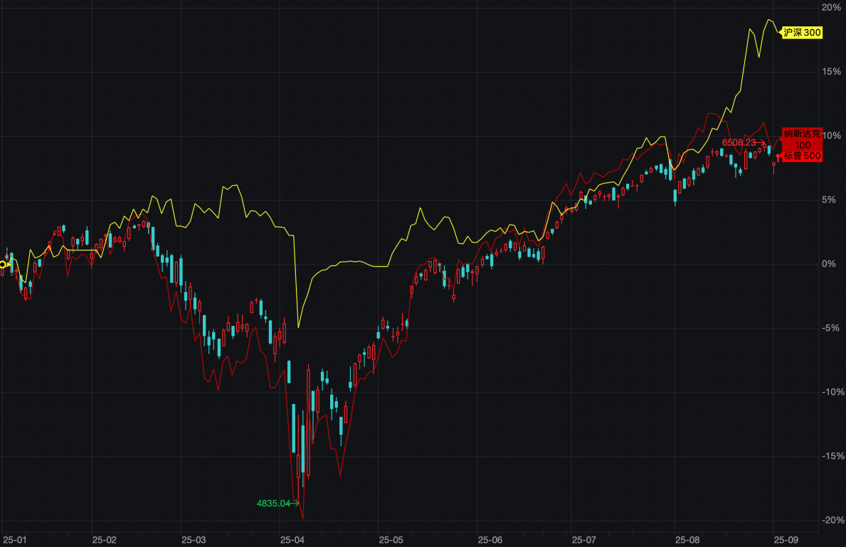 沪深300和美股指数年初以来走势;资料来源:Wind,截至2025-9-3