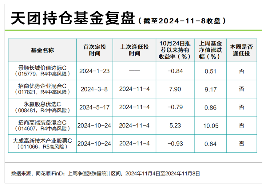 周5只持仓基金均没有现逢低投机会。但如果未来成交缩量,则应重回防守状态;如果流动性依然充裕,则选择阻力较小方向,如防军工进行布局。
