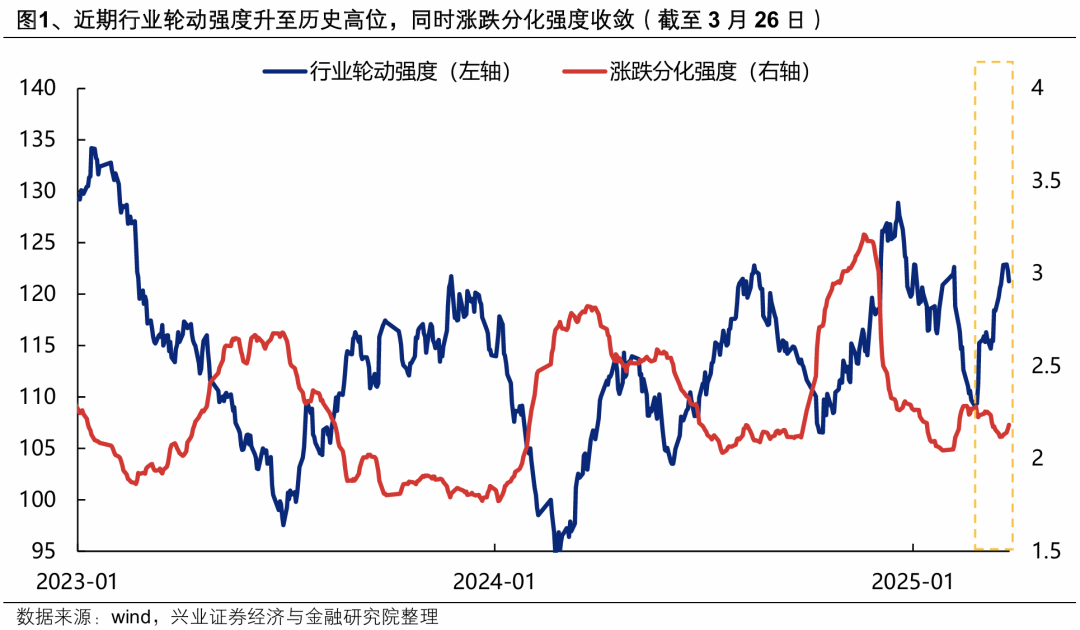 市场缩量另一方面就是存量资金剧烈博弈,带来快速轮动,数据显示,2旬以来,市场行业轮动强度持续提升,目已经升至历史高位,这个阶段市场比较乱,难以分化明确主线。