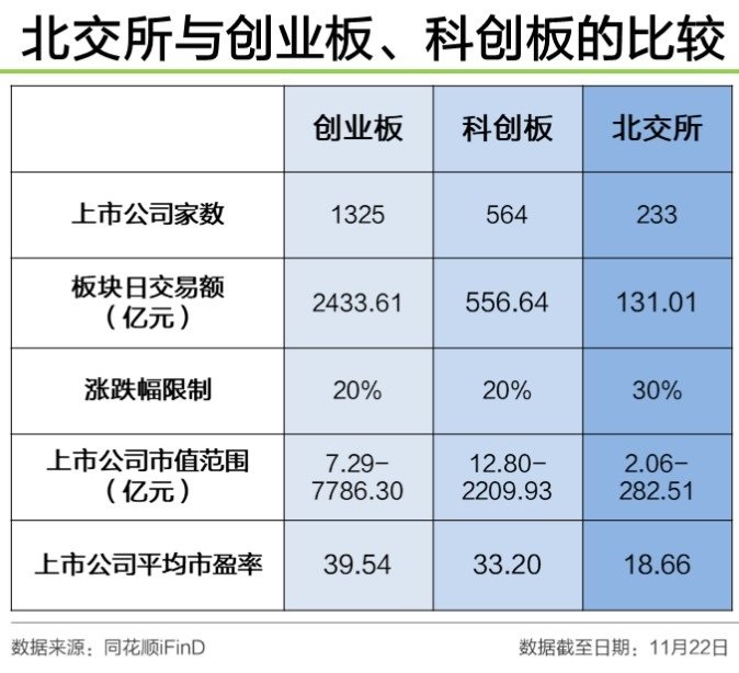 另外,如果想在北交所开户,需要满足50元资产、24个交易经验等要求,主要面向成熟股票投资者。而北交所个股单涨跌幅限制为30%,是主板个股3倍,其单波动也很大。