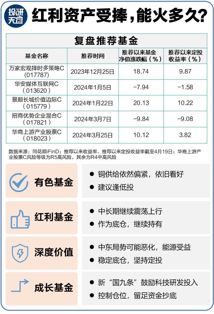 海外方面也有重要变化。以色列伊朗进行军事打击报复,冲突续变化具有巨大不确定性,投资者可能会偏黄金等避险资产,资源类资产也会受益。们有色金属中铜依然看,美通胀现了二次抬头风险,美联储降息过程比较波折,虽然美元走强,铜价带来一定压力,但考虑到供给依然偏紧,铜价看方向不变,们建议逢低定投华商游产业股票C,控制买成本。