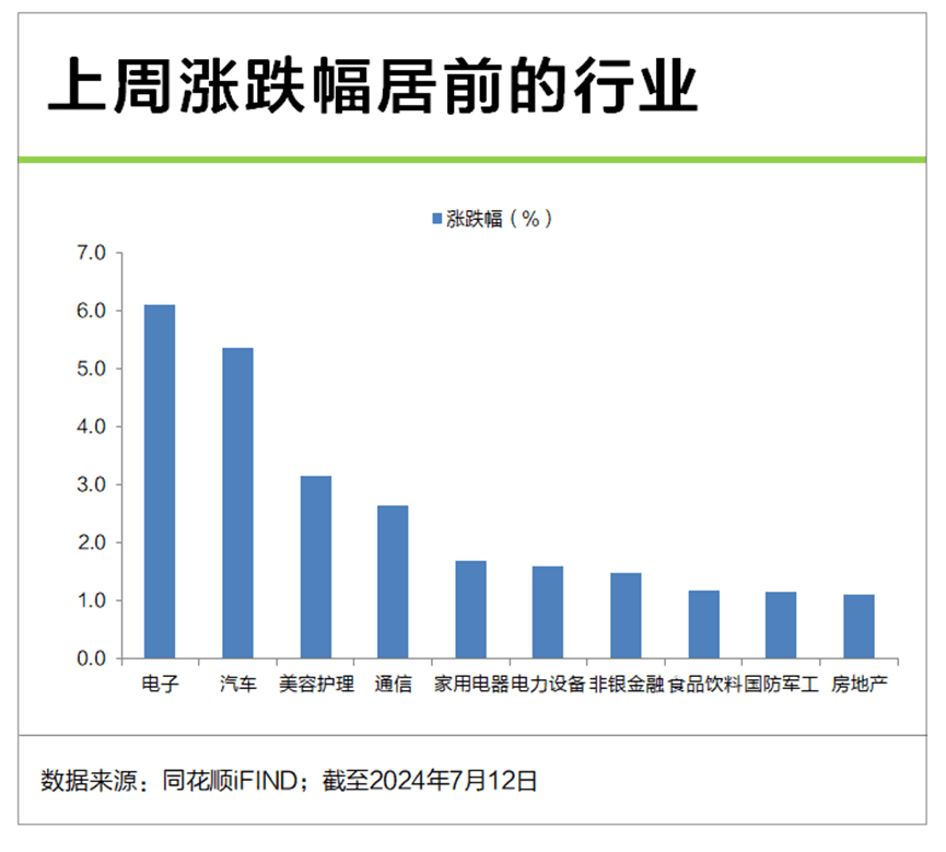 本周,A股进党二十届三中全会时间,市场改革政策关注度提升。同时,市公司中报业绩将陆续披露,业绩于预期板块、个股会有所表现,这一点周行情已有所体现。