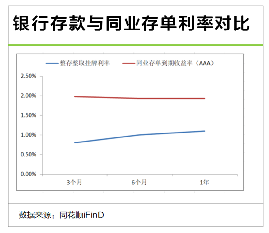 简单比一,无论哪个期限同业存单到期收益率,都比行整存整取挂牌利率要有优势。