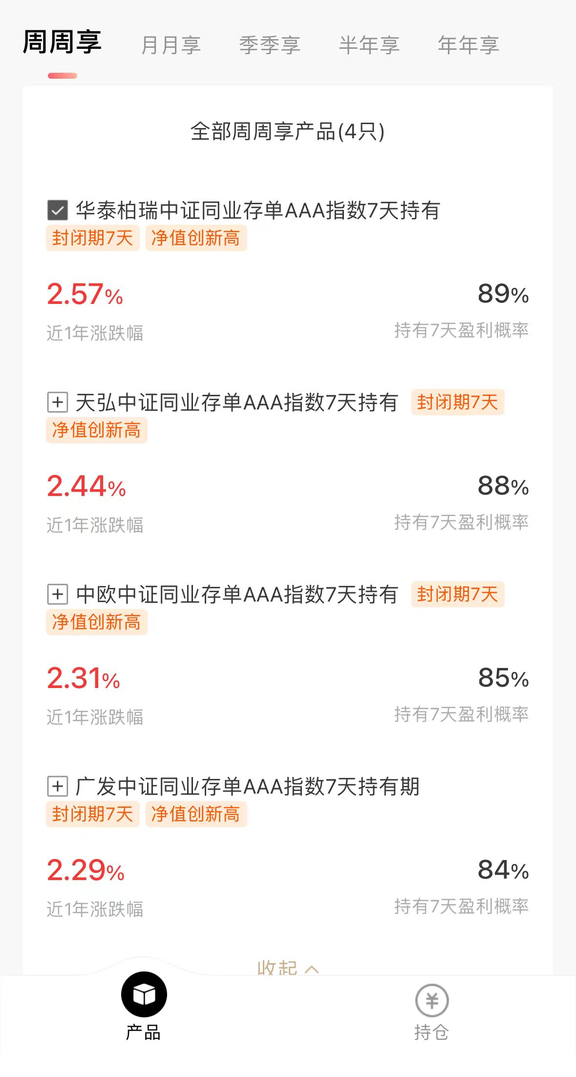 打开周周享页面,推荐基金一共4只,清一色“XXX中证同业存单AAA指数”。