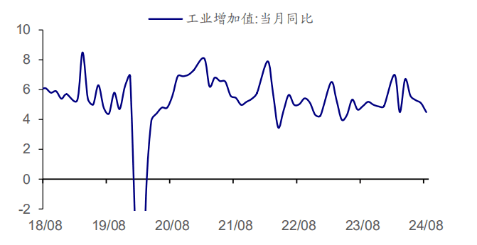 1、生产持续边际走弱:1-8 工业增加值累计同比增长 5.8%,8 同比增长 4.5%,均较一小幅行,连续第四个回落。