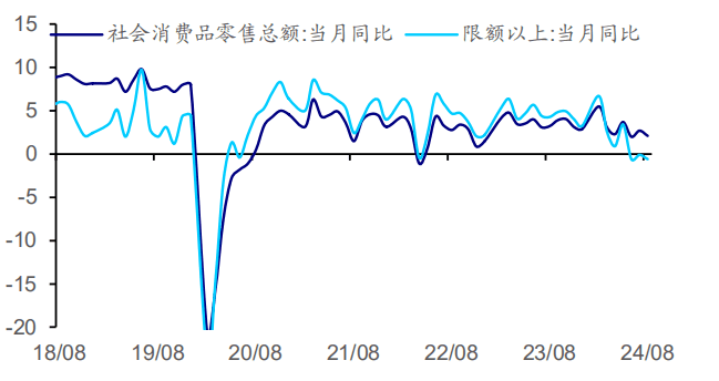 2、消费未见起色:8 社零当同比增速为 2.1%,较 7 2.7%有所回落。从季调环比来看,8 社零环比增速为-0.01%,由正转负,是除 2022 年以外首次在 8 现环比负增。