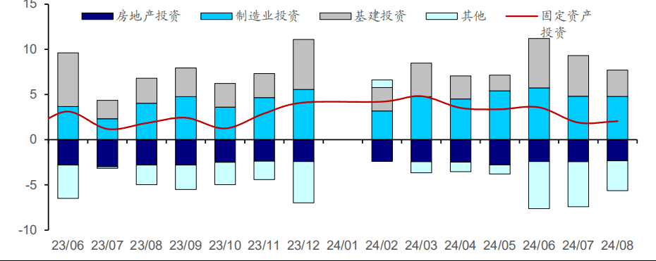 3、投资边际走弱:1-8 固定资产投资完成额累计同比增速为 3.4%,较 1-7 小幅回落,制造业仍是主要支撑,基建产依然较弱。