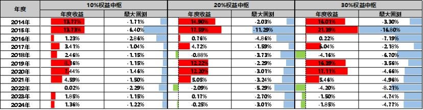 从近十年数据来看,+10%权益,可以实现年年正收益,且除去极端市场行情年份(2015年),在自然年度最大回撤不超过3%。