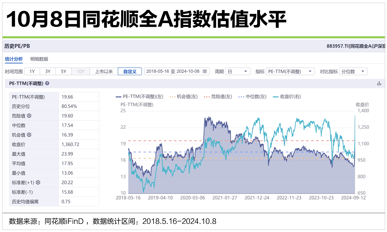 108,同花顺全A指数PE估值是19.66,中位数为17.54,应历史分位是80.54%。