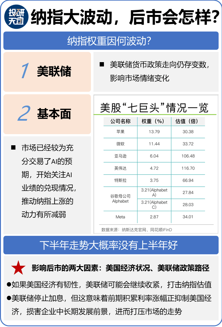 短期内,AI在“七巨头”业绩预测中重要性会降。投资者要从仰望AI星空转成脚踏实算企业基本面和估值。们纳指观察,也从AI有多牛框架,回到了传统美经济表现和货币政策拉扯关系。