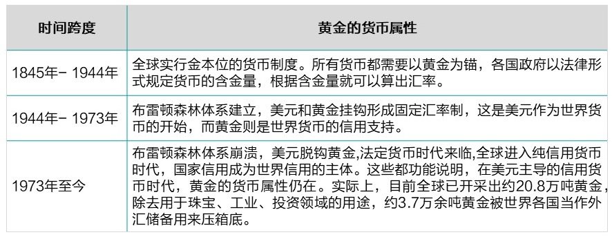在金本位时代,黄金本身就是钱,这就是它货币属性。表梳理了黄金货币属性发展脉络。