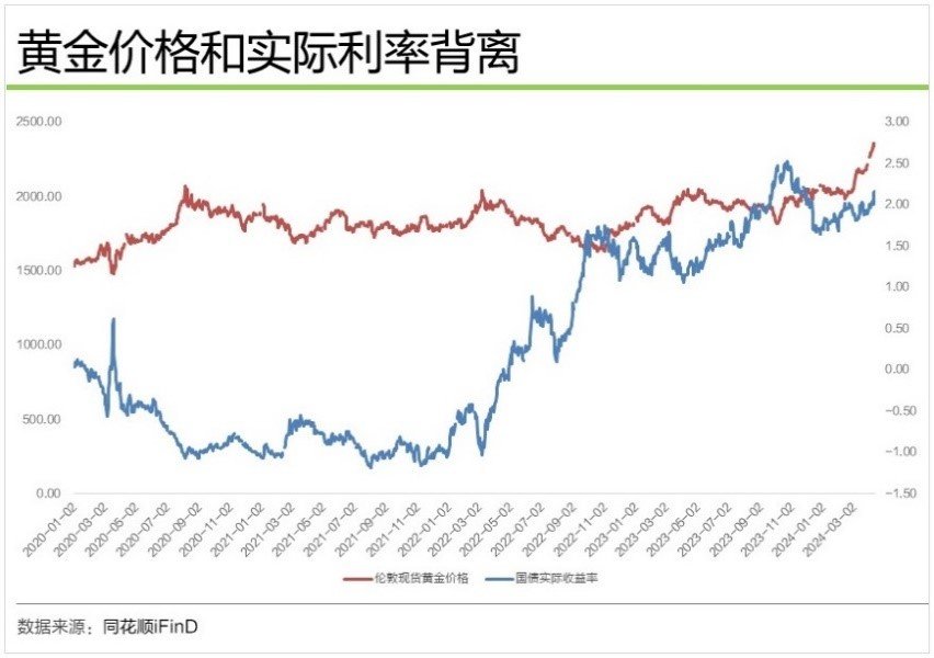 按传统分析框架,黄金是不生息资产,其价格主要与美实际利率负相关,但是2023年以来,二者此消彼长关系变得不清晰,尤其是近期,金价与美实际利率完全背离。
