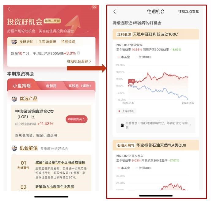 在【投资机会】中,们不仅提供选基方向,也展示推荐基金过往业绩,供大家检阅和复盘。