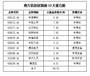 南方信息创新在2023年持续集中投资半导体自主可控子行业,聚焦在半导体设备、零部件、材料、EDA软件、AI算力芯片等领域。根据二季报,基金维持高新技术产业,特别是半导体相关行业个股深度持仓,十大重仓中有七个都属于半导体行业股票,十大重仓股合计占比64.83%。
