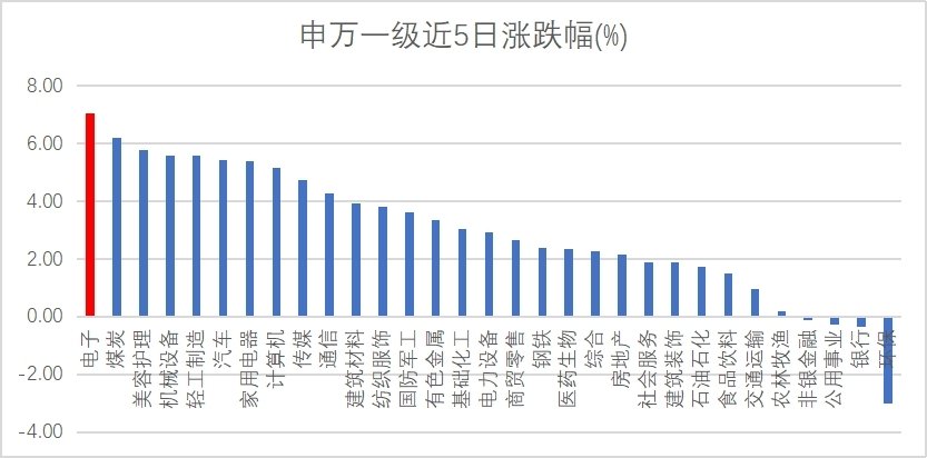 们看到周申一级行业中,电子最终涨幅7.06%,列位第一:
