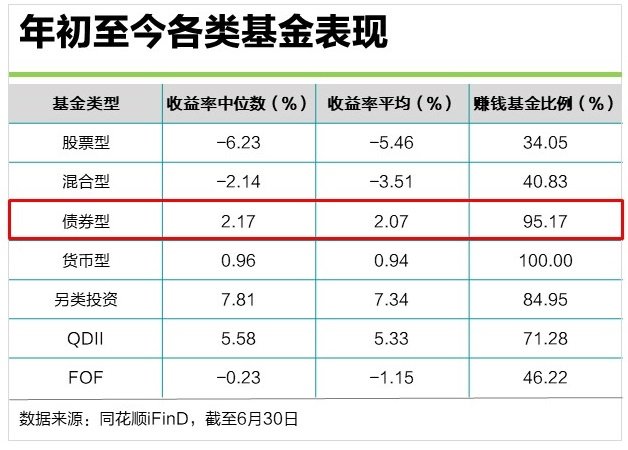 如图,今年半年基金业绩回报统计显示,95%以债基取得了正收益,收益率中位数为2.17%。