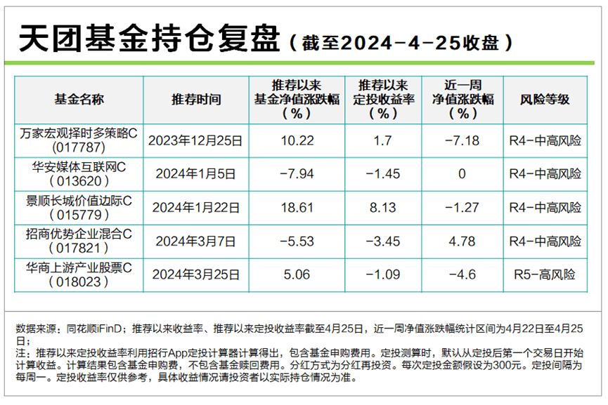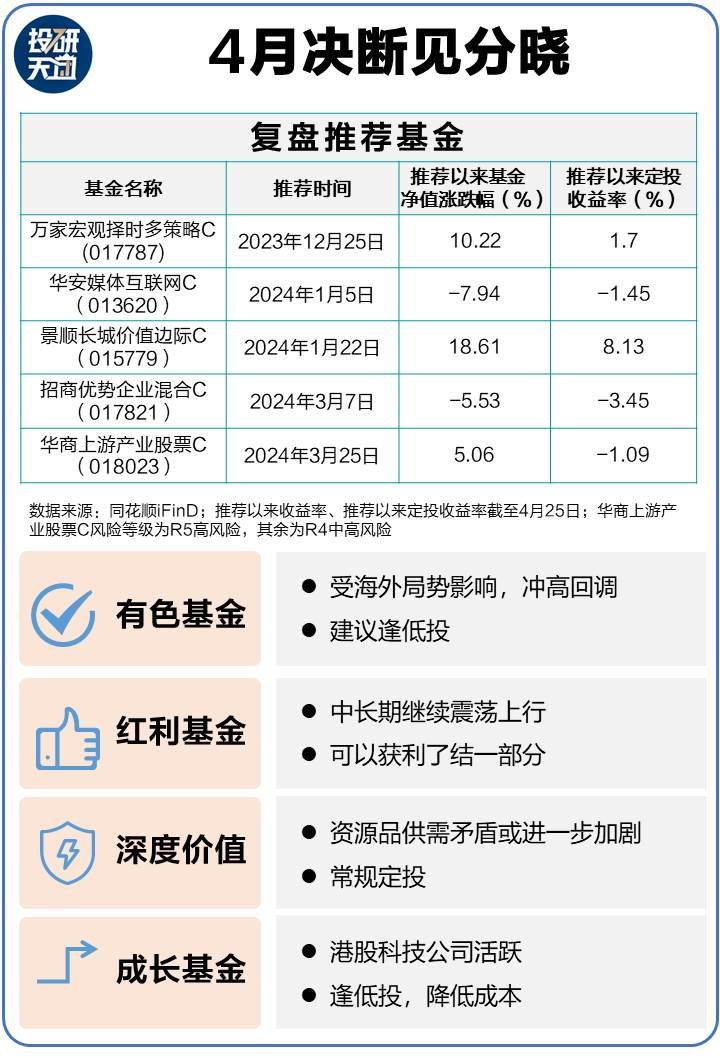 整个3,们都在提示把抄底仓位卖,准备现金再次逢低买。412,们又提示家宏观多策略择时C改为持有,华商游产业股票C、华安媒体互联网C、商优势企业C三只基金改为逢低投,降低投资成本。