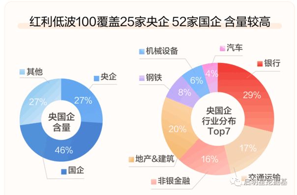 从持仓类型,央企占比较高。以红利低波100指数为例,100只股票中超过70%成分股为央企属性。