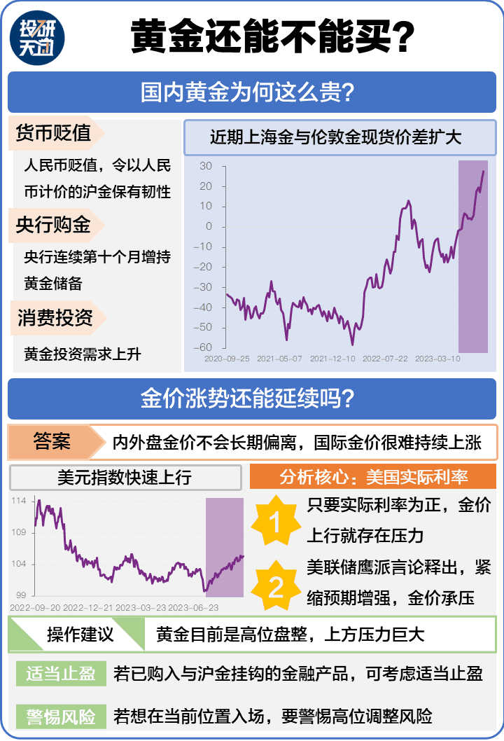 天团判断,这种持续涨是短期。原因是,内外金价不会长期偏离,而强势美元环境,际金价很难持续涨。