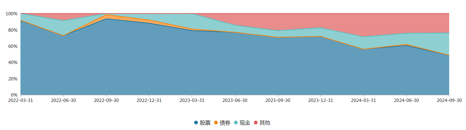 2022年三季度起,杨思亮主动降低了产品股票仓位占比,股票仓位在2024年三季度降至48.66%,这一变化反映基金管理人在市场波动中采取了防御性仓位管理策略。这种调整有助于降低风险,特别是在市场不确定时期。