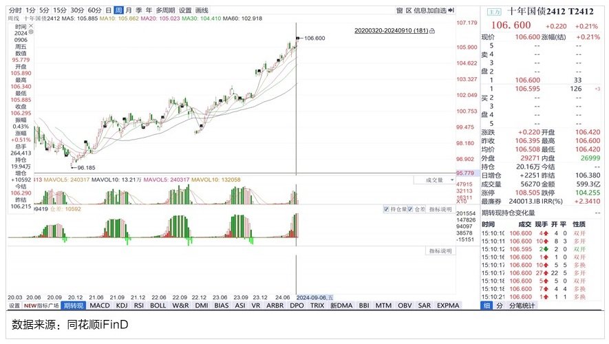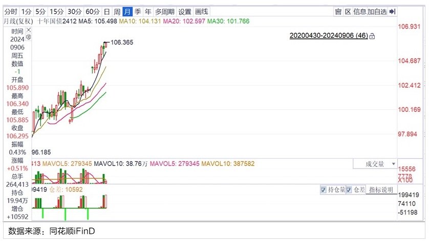 经过8调整之,在9第一周,债市重拾涨势,成交量也比8明显增加。10年期债期货在9第一周收于106.295,逼近近期高点。